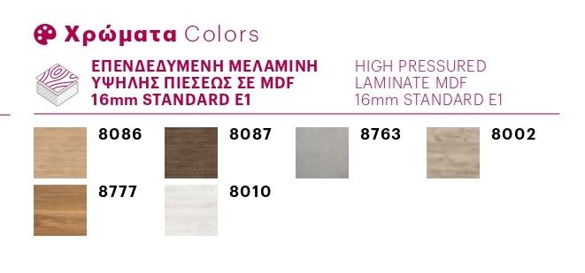 Διαθέσιμο σε πολλές χρωματικές επιλογές, 16 αποχρώσεις Λάκας Γυαλιστερής ή Ματ & 6 Αποχρώσεις Επενδεδυμένης Μελαμίνης σε MDF.