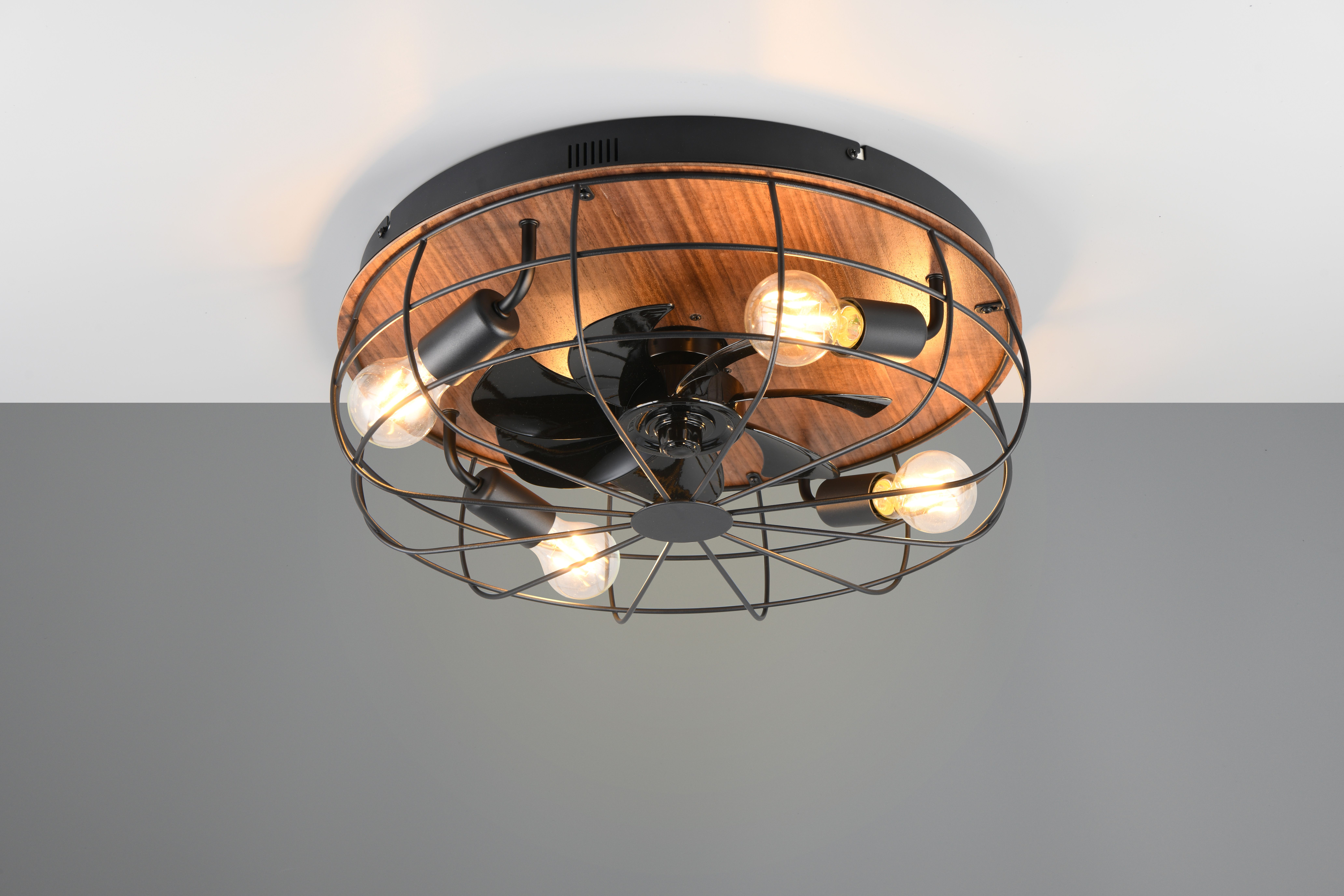 The modern design in matt black and wood color allows the ceiling light to blend in perfectly with existing interiors.