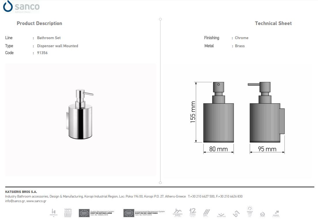 Αντλία Σαπουνιού 500ml Επιτοίχια 8x9,5x15,5 cm Brass Chrome Sanco Metallic Bathroom Set 91356-A03-500