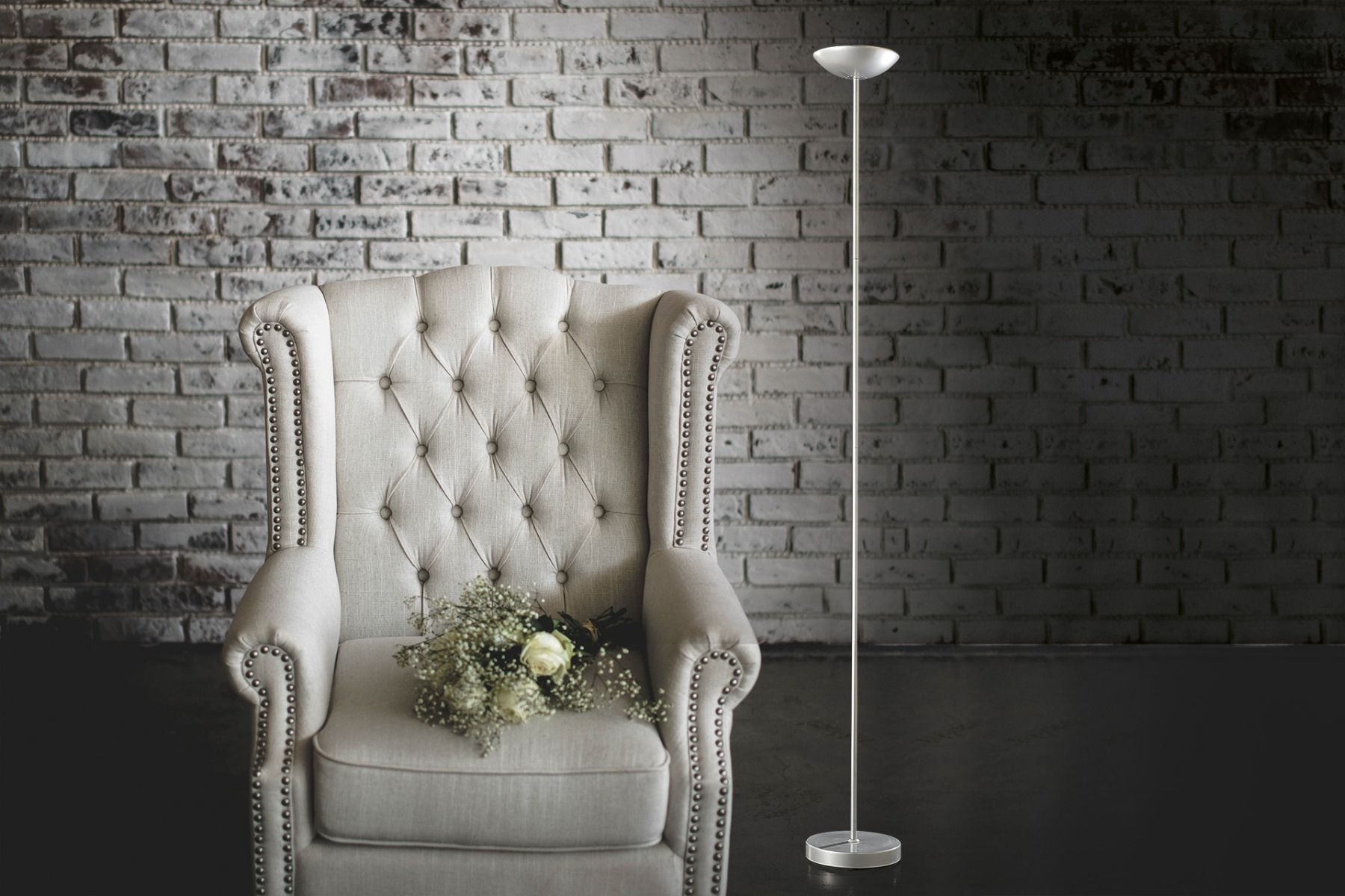 Metal floor lamp with white or silver finish.