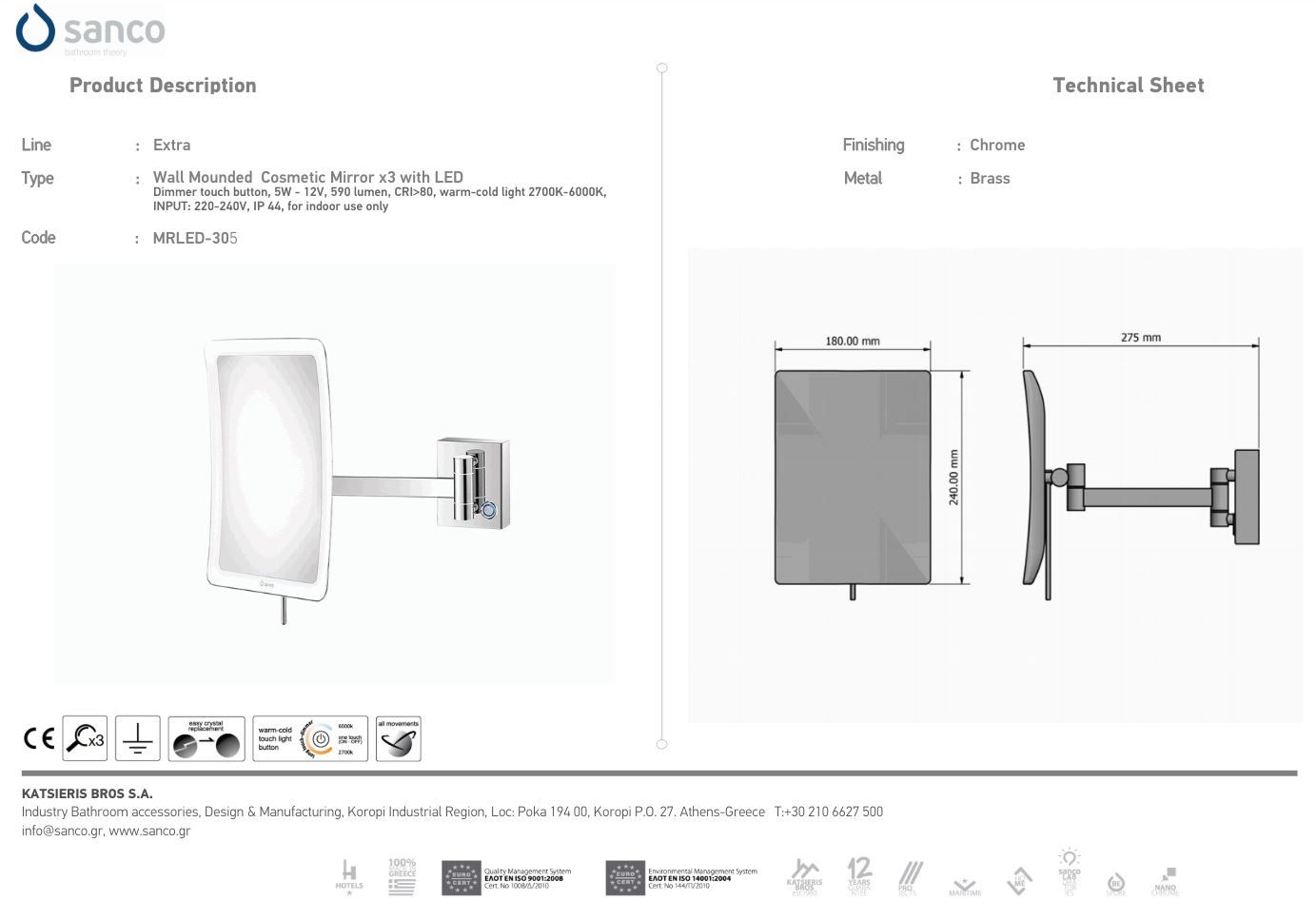 Επιτοίχιος Μεγεθυντικός Καθρέπτης x3 Led 5watt 220-240V IP44 Sanco Led Cosmetic Mirrors Gun Metal MRLED-305-A23