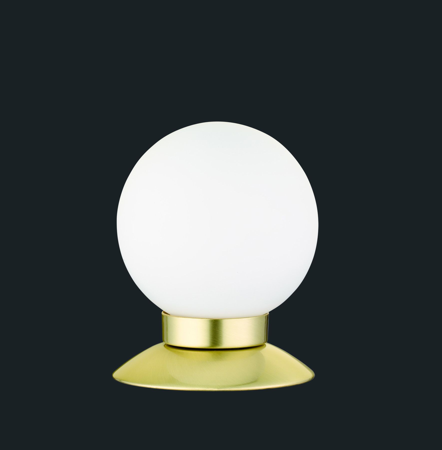The table lamp has a base in matt brass and a round, white glass that emits an even light.
