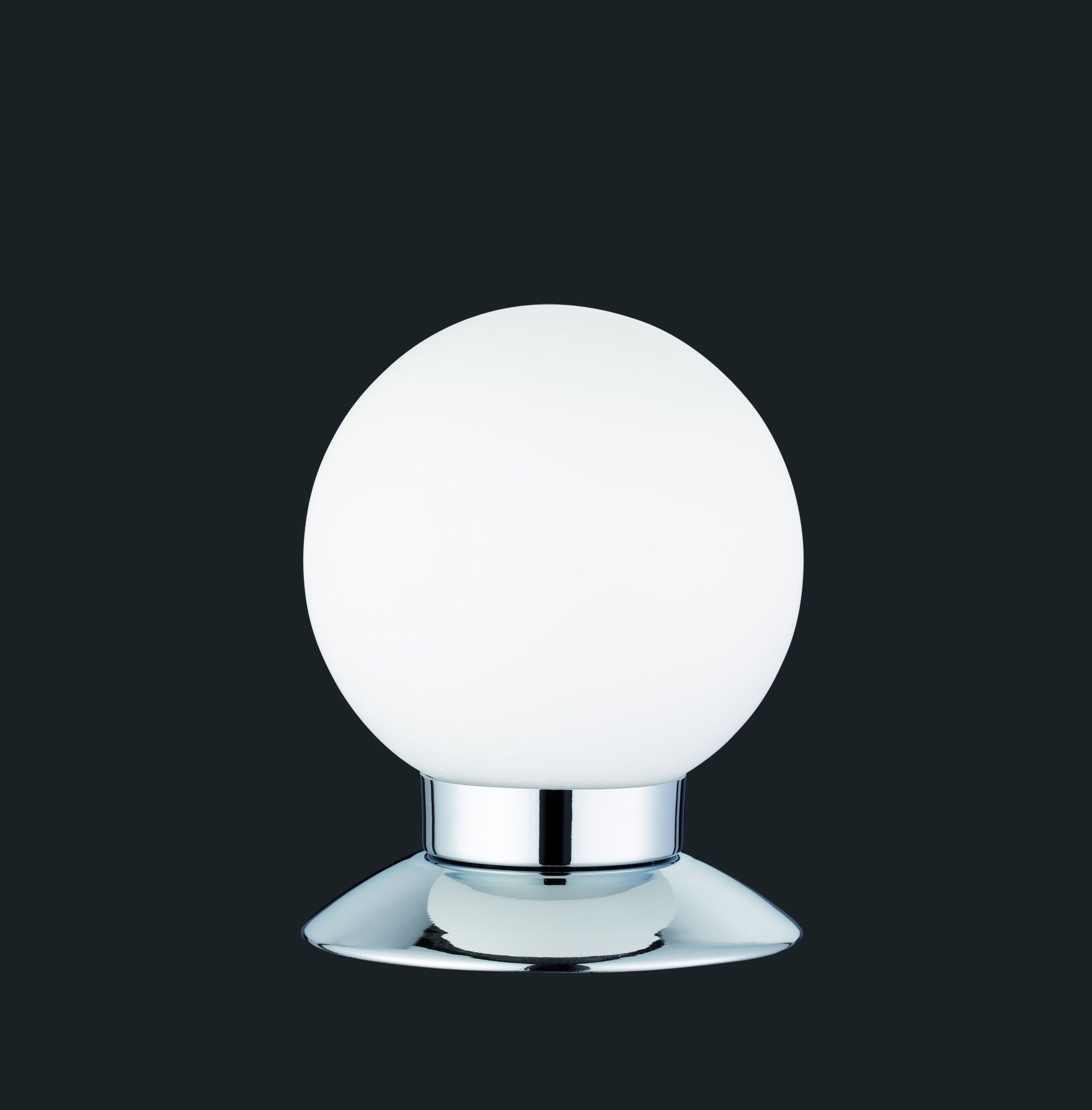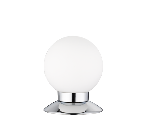 The table lamp has a chrome-coloured base and round, white glass that emits a uniform light.