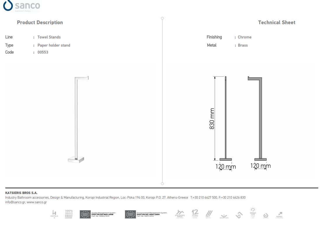 Καλόγερος Χαρτοθήκη Επιδαπέδια W120 x D120 x H830mm Ορείχαλκος Sanco White Mat 0553-M101