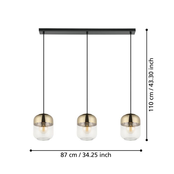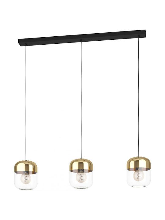 Τρίφωτο κρεμαστό φωτιστικό ράγα από την εταιρεία Eglo σε χρυσό χρώμα, με υποδοχές για 3 λαμπτήρες και ντουί E27. Είναι κατασκευασμένο από μέταλλο, ένα υλικό δημοφιλή στα κρεμαστά φωτιστικά οροφής, καθώς πέρα από τη μοντέρνα νότα που προσφέρει, είναι ιδιαίτερα ανθεκτικό στον χρόνο. Καθαρίζεται εύκολα με ένα πανί.