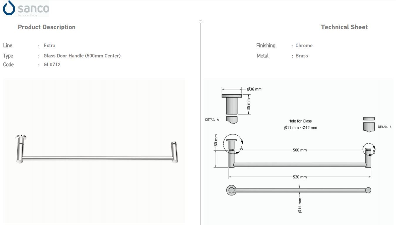 Λαβή -Πετσετοκρεμάστρα για Τζάμι Ντουζιέρας Χρωμέ W52xD6cm Sanco Glass Door Accessories GL0712-A03
