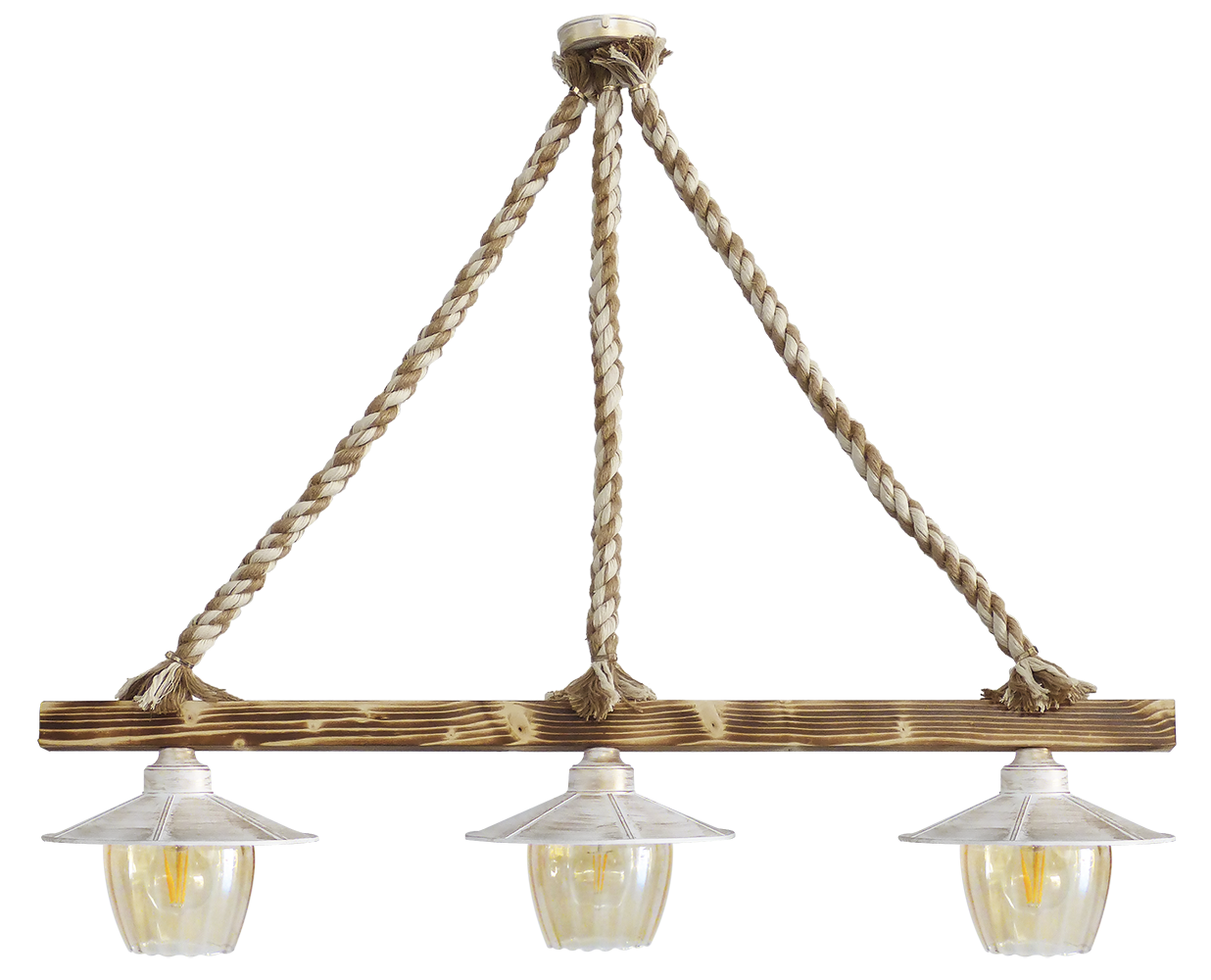 Κρεμαστό φωτιστικό 3/φωτο με ξύλινη ράγα και σχοινιά mix ,τα καπελάκια είναι σε χρώμα λευκό-μπρονζέ με γυαλιά μελί ΜΙΧ-98RAGA 3/L ROPE ΜΙΧ-WH-BR