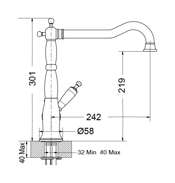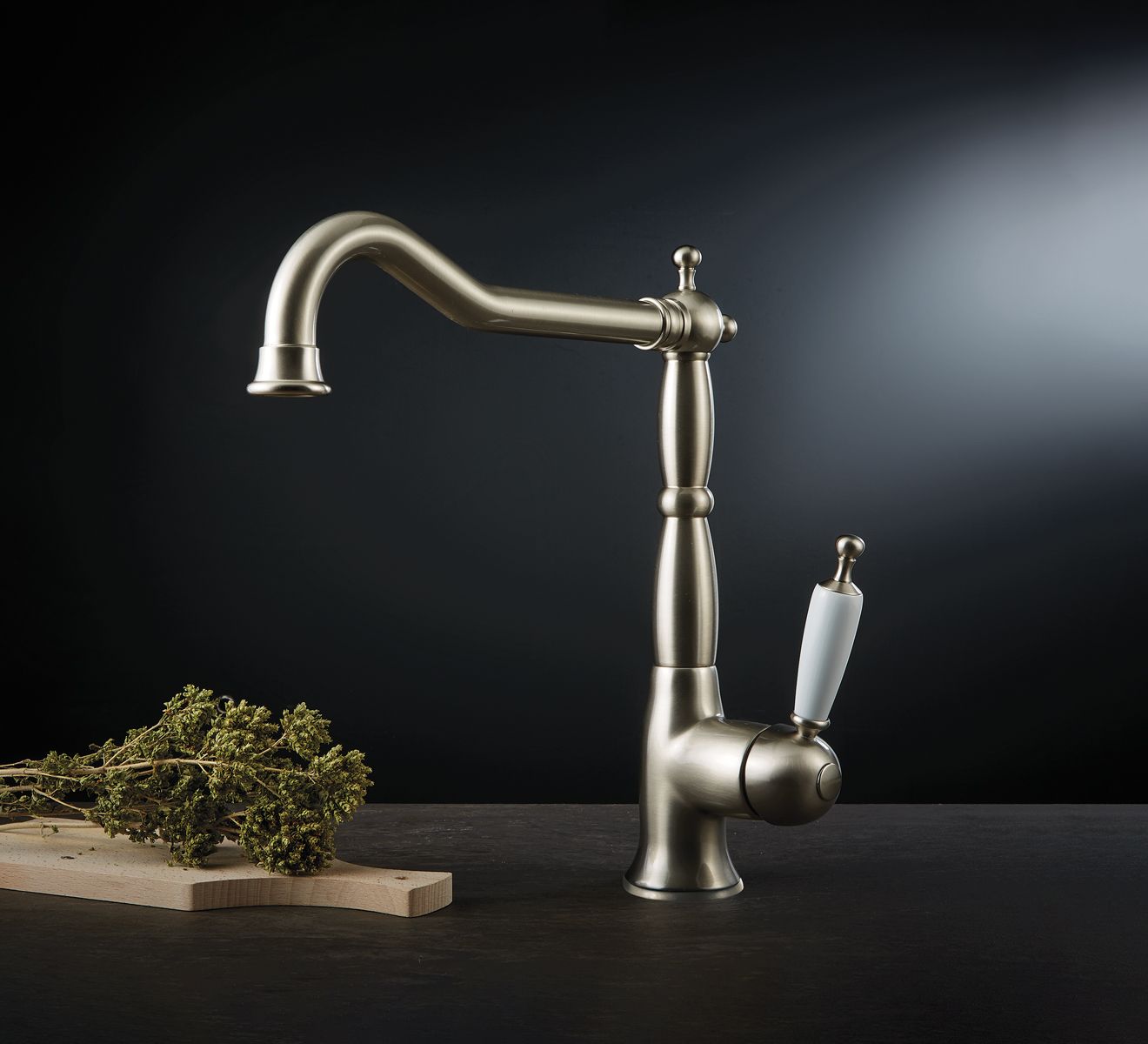 Μπαταρία Νεροχύτη Κουζίνας Ύψος 30 εκ. με Μακρύ Περιστρεφόμενο Ρουξούνι Retro Inox Finish -Λευκό Πορσελάκι Bugnatese Oxford 6382-110