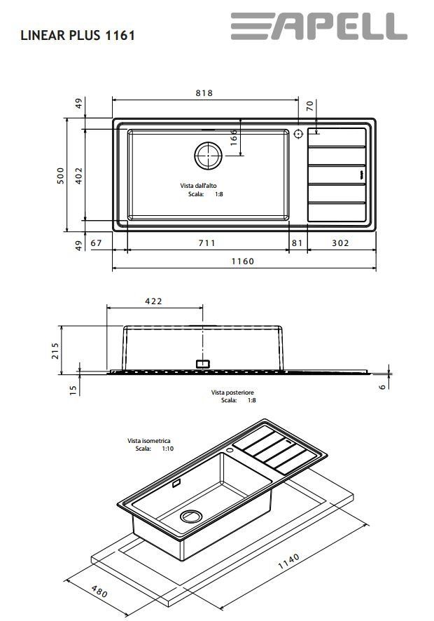 Νεροχύτης Ένθετος με ποδιά Δεξιά 116*50 εκ. για ερμάριο 90 εκ. Apell Linear Plus LNP1161-R