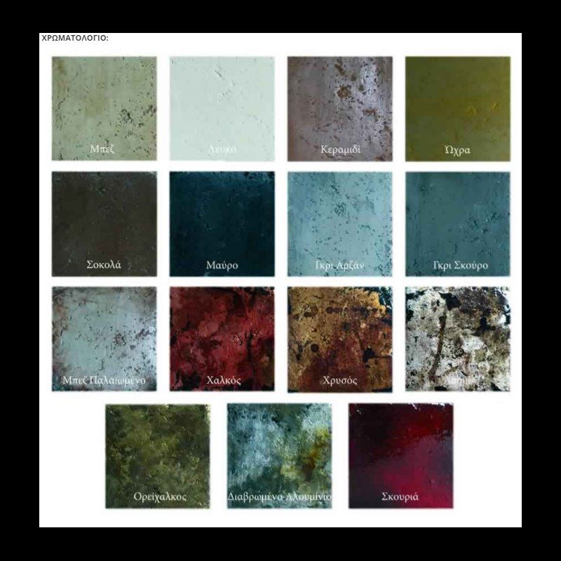 1. Υλικά παραγωγής πέτρας τεχνικά από φυσικά υλικά: ηφαιστειακή σκόνη – μείγμα θερμικής ρητίνης – ανθρακικό ασβέστιο – τιτάνιο – χρώματα από σκόνες αγιογραφίας.