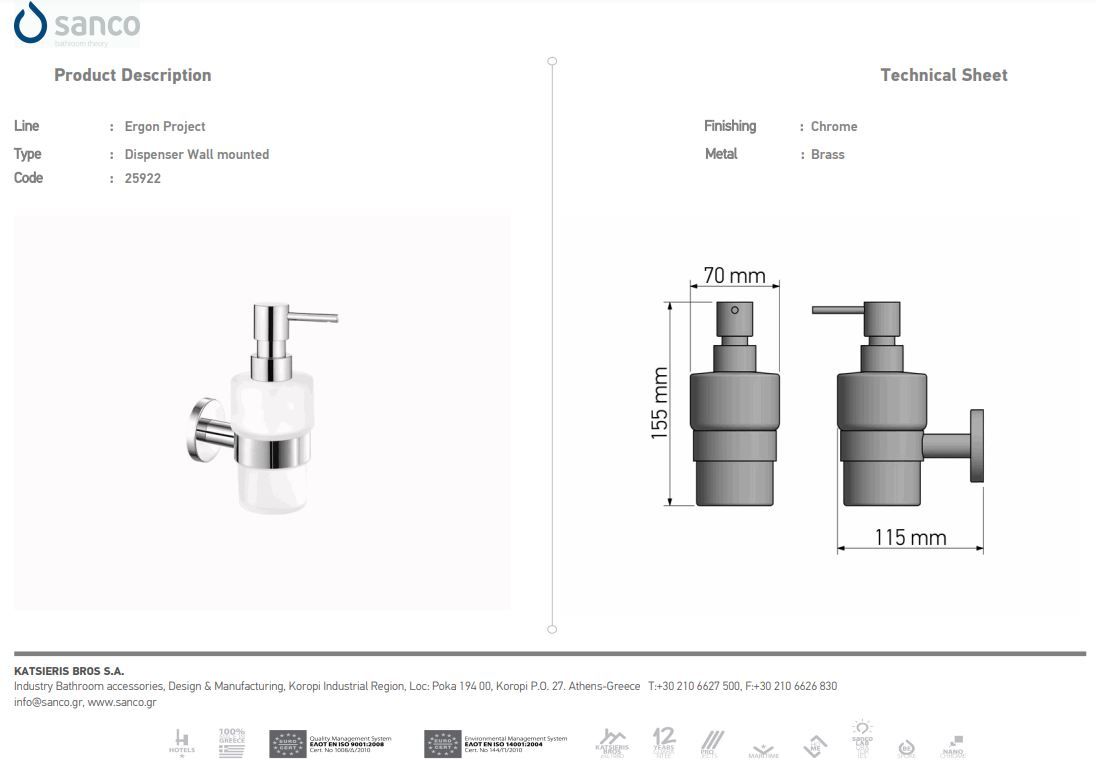 Ντισπένσερ Επιτοίχιο Χρυσό 24Κ Sanco Ergon 25922-A05
