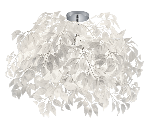 An enchanting lighting object for living areas whose style can be categorized as The white plastic leaves and the chrome-coloured canopy can be combined with other different color concepts,