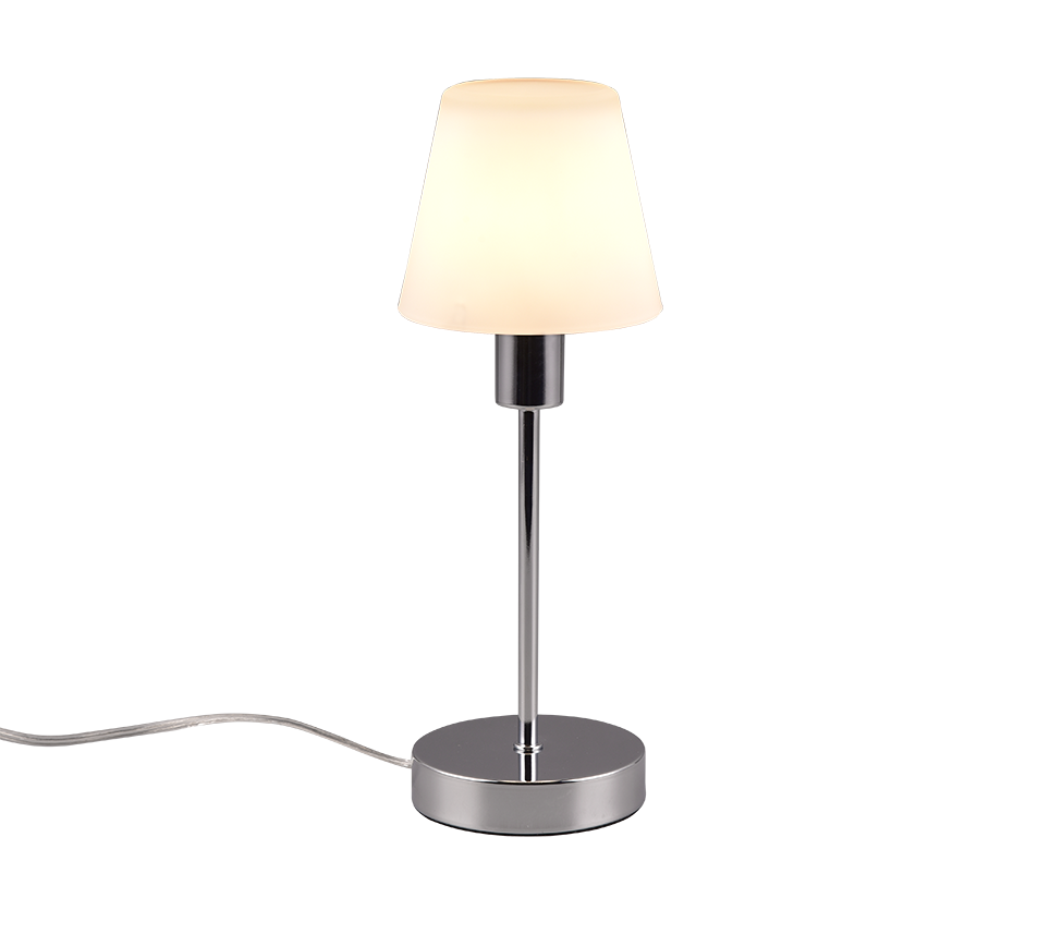 The clear, understated design consists of a chrome base and a chic white lampshade.