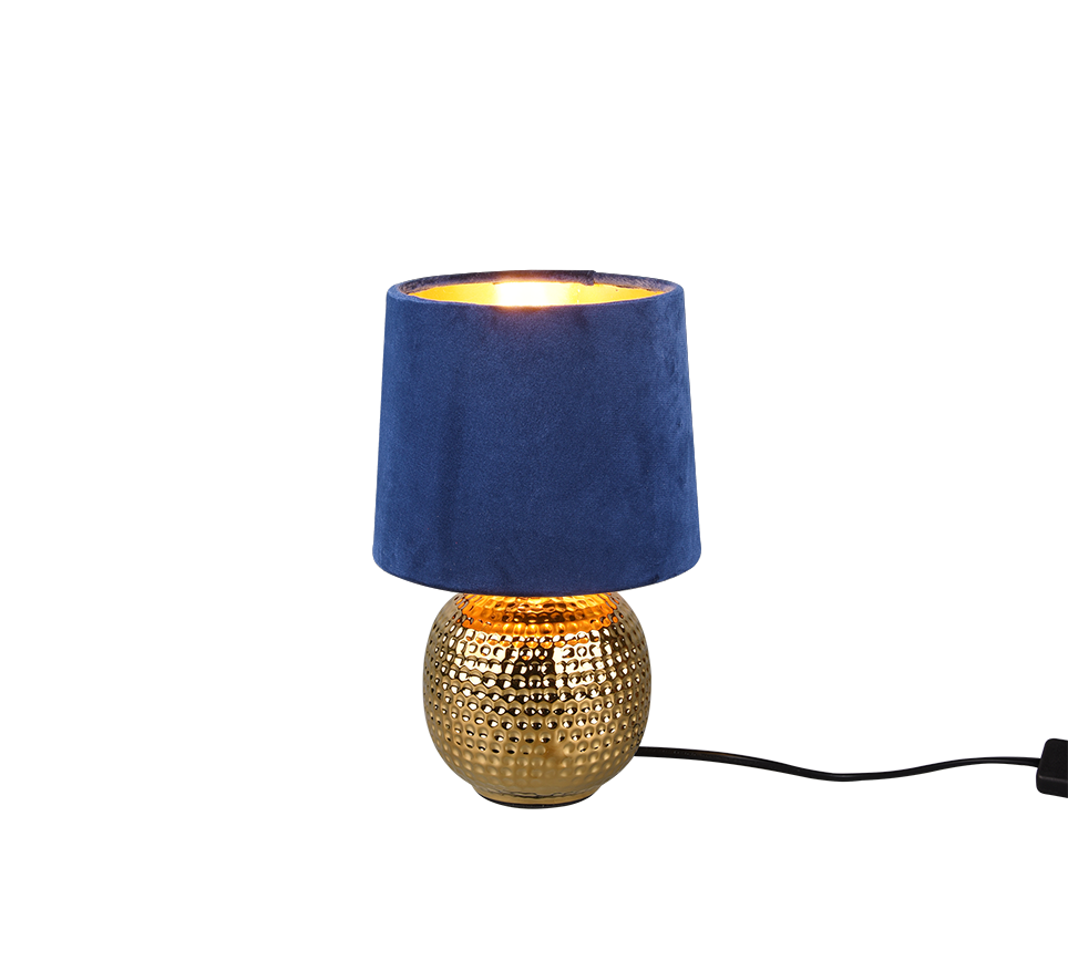 The combination of ceramic in gold and the fabric shade in blue creates a modern look. For energy-saving lighting, it is recommended to use an LED illuminant.