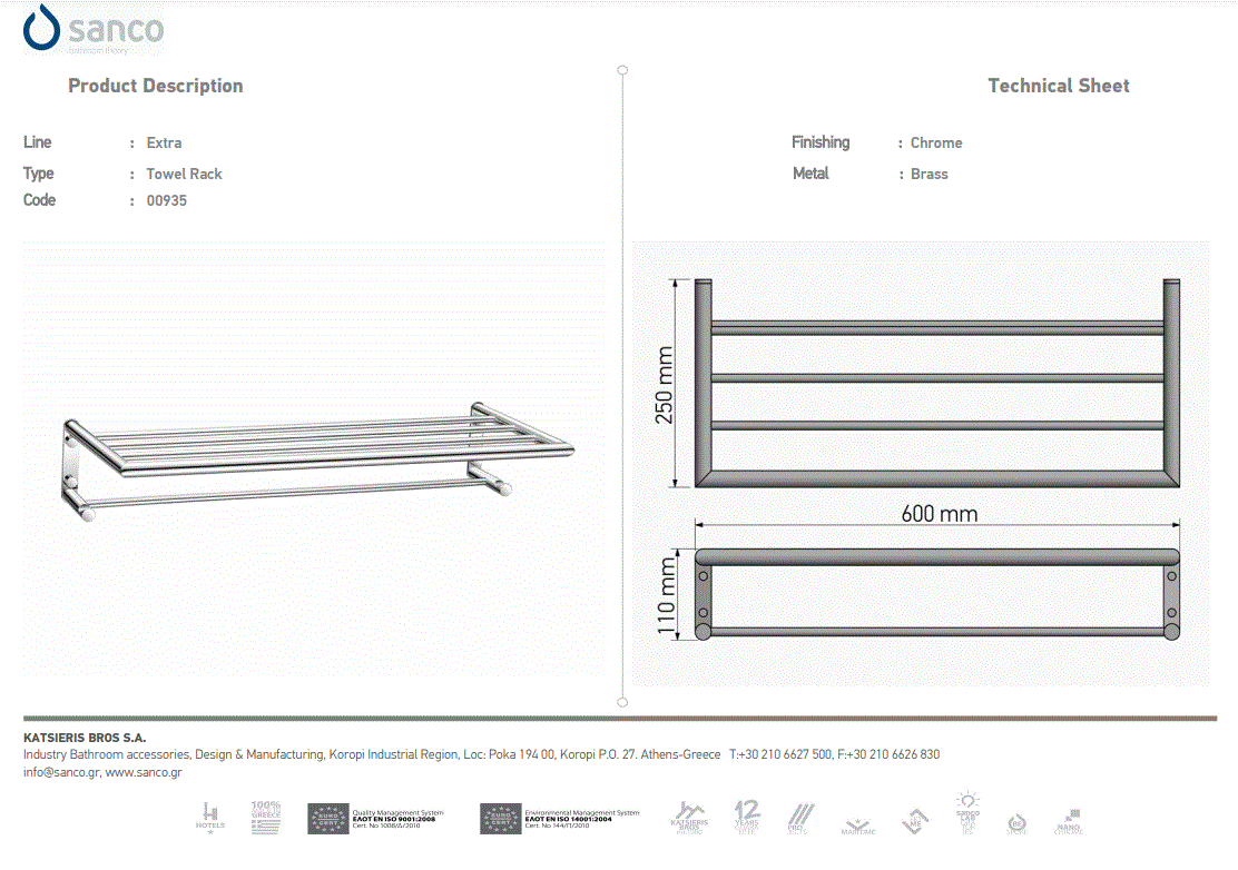 Ραφιέρα Πετσετών W60xD25xH11 εκ. Χρωμέ Sanco Towel Racks 0935-A03