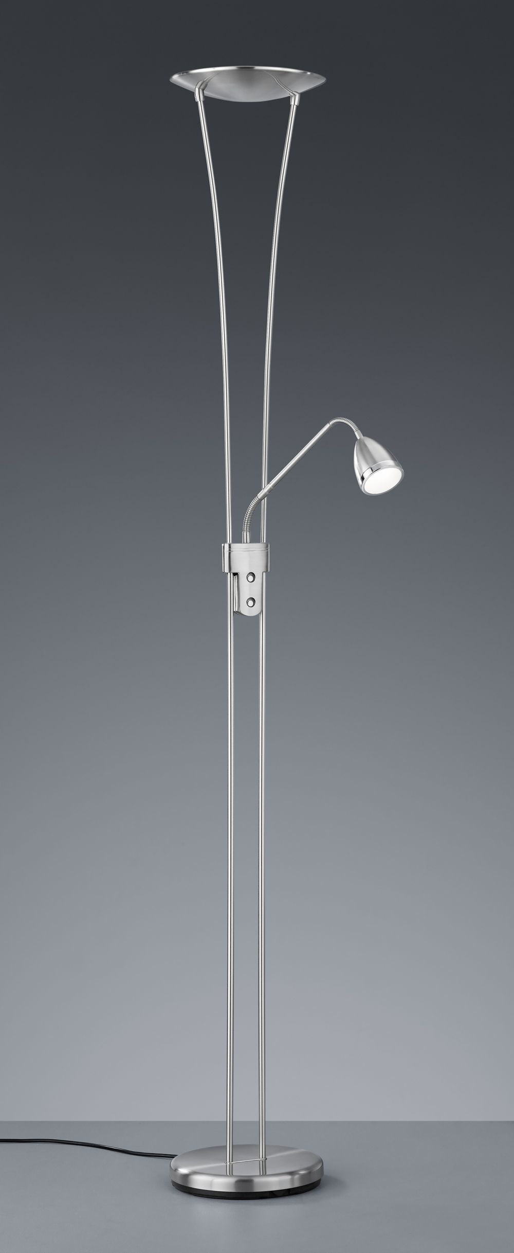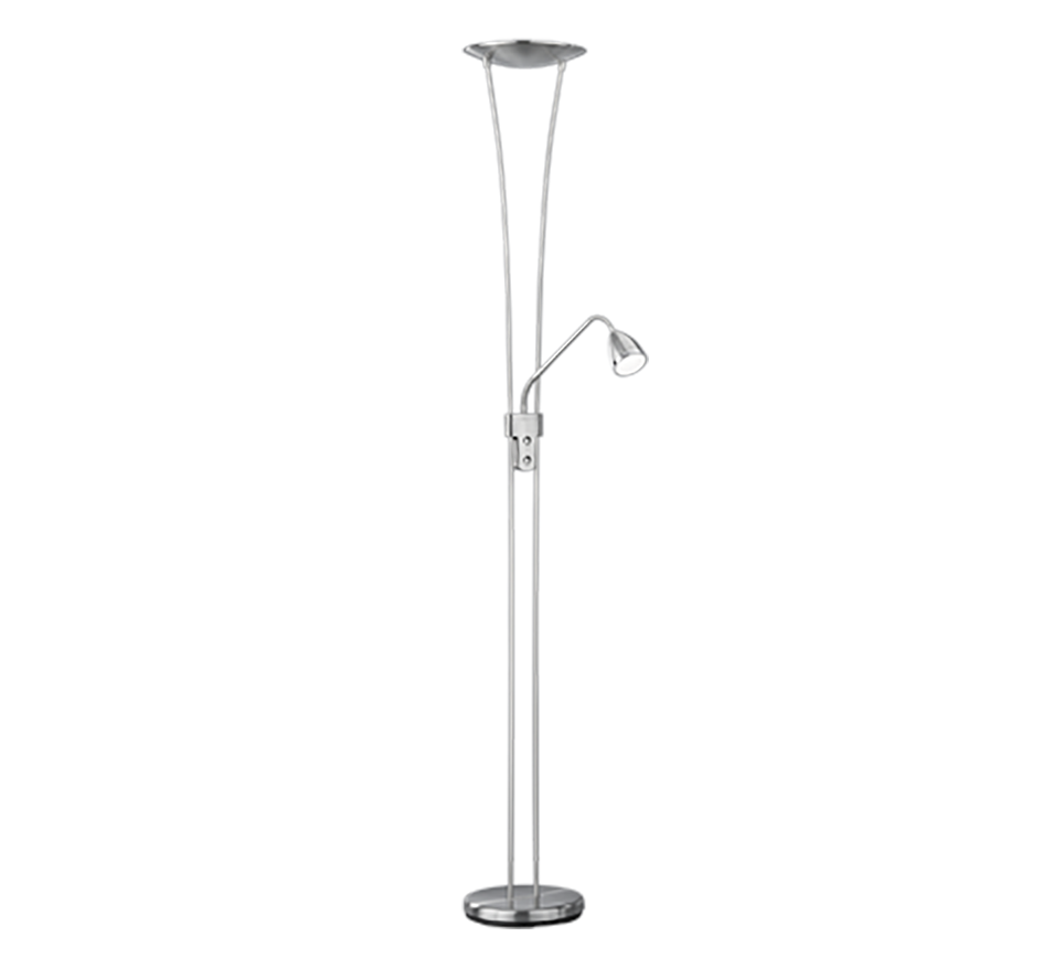 Φωτιστικό δαπέδου Arizona της Trio Lighting σε ασημί χρώμα, με ενσωματωμένο LED. Το ενσωματωμένο LED εκπέμπει θερμό λευκό φως, το οποίο αποδίδεται στην κλίμακα Kelvin με τιμές από 2400Κ έως 3000Κ. Αυτοί οι τόνοι του λευκού είναι πιο πορτοκαλί σε σχέση με το φυσικό φώς.