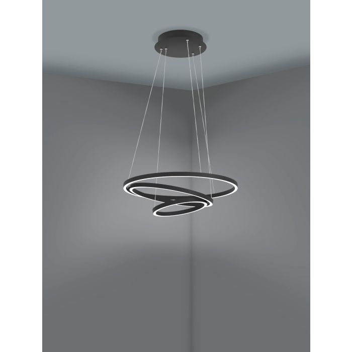 The LOBINERO-Z LED pendant light from the connect. Z Smart home range features a black steel frame with three suspended ring-shaped LED profiles, which are individually adjustable.