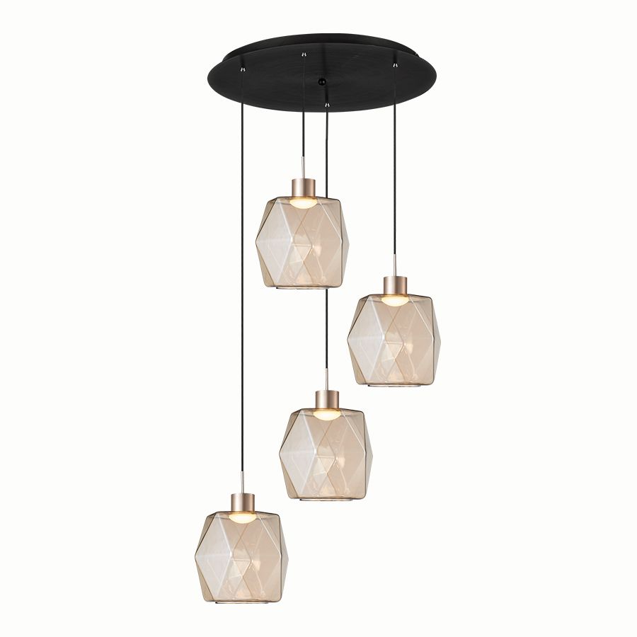 Τετράφωτο κρεμαστό φωτιστικό σε ροζέτα κατασκευασμένο από χειροποίητα γυαλιά σε μελί χρώμα και μεταλλική βάση σε μαύρο χρώμα.| Χρώμα | Μελί-Φιμέ-Amber-Fime |