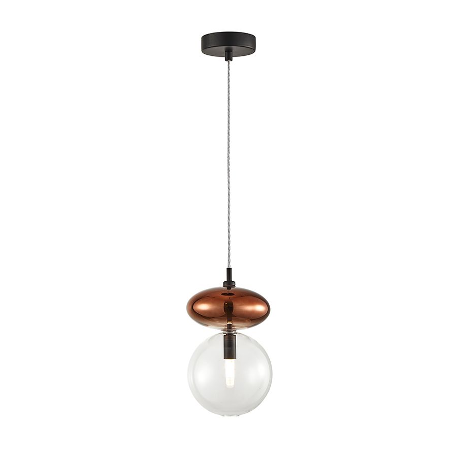 Μονόφωτο κρεμαστό φωτιστικό κατασκευασμένο από χειροποίητο γυαλί σε αποχρώσεις διάφανου και χαλκού με μαύρα μεταλλικά στοιχεία.| Χρώμα | Διάφανο-Trasparent-Clear |