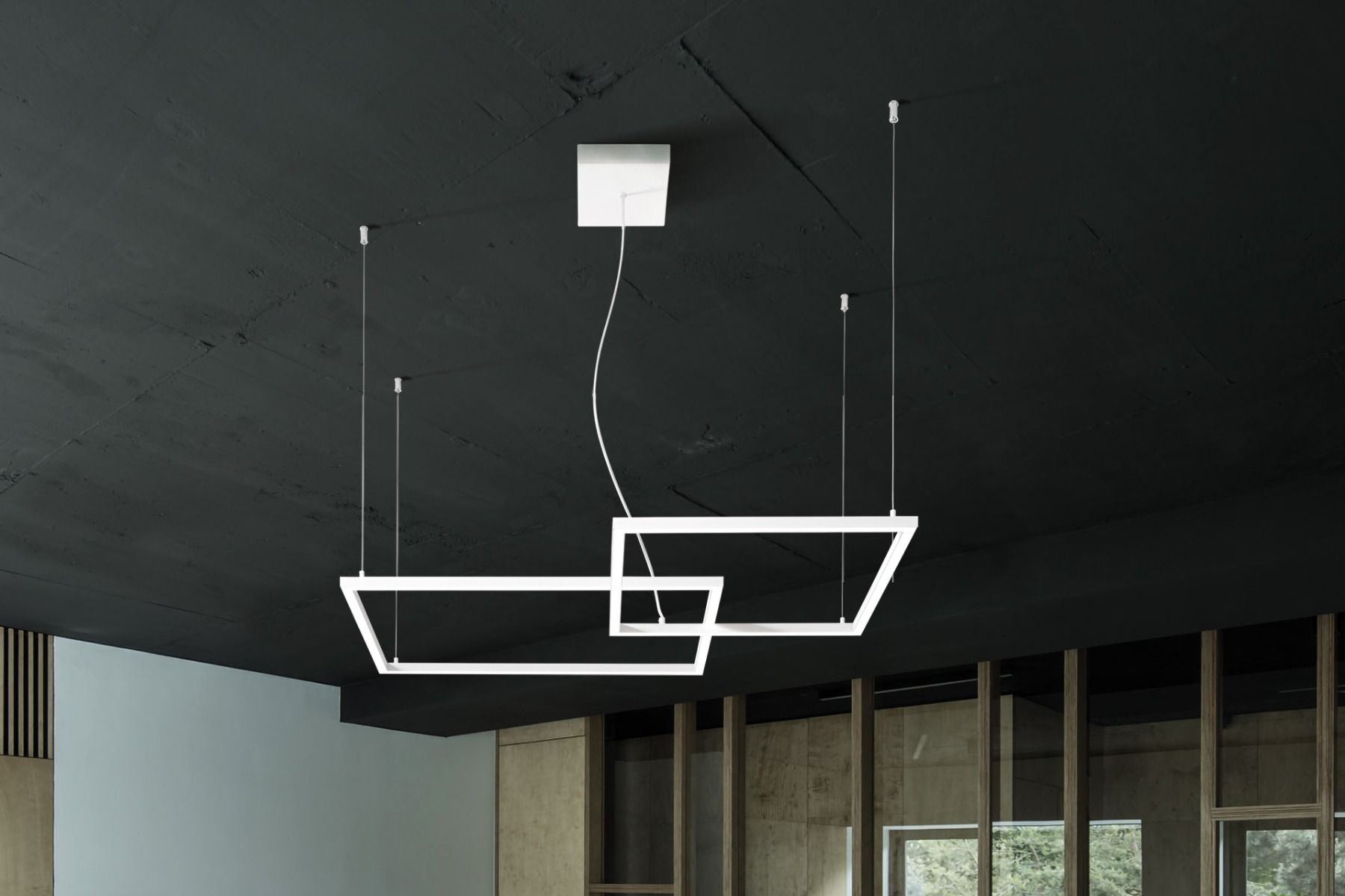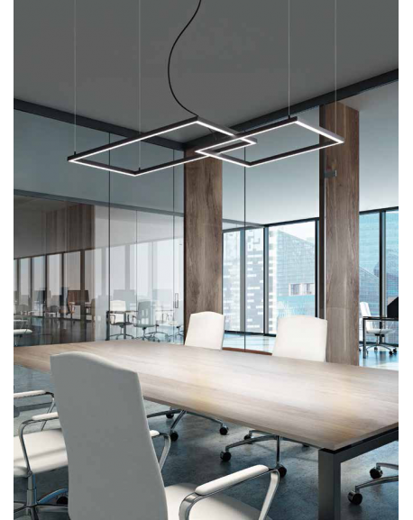 Hanging lamp consisting of two matt white powder-coated aluminum frames with satin acrylic diffuser, cables adjustable in length.