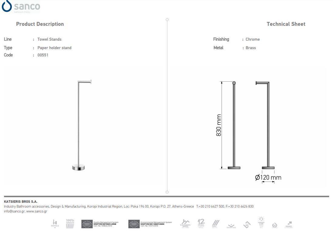 Χαρτοθήκη Επιδαπέδια W120 x D120 x H830mm Ορείχαλκος Χρωμέ Sanco 0551-A03
