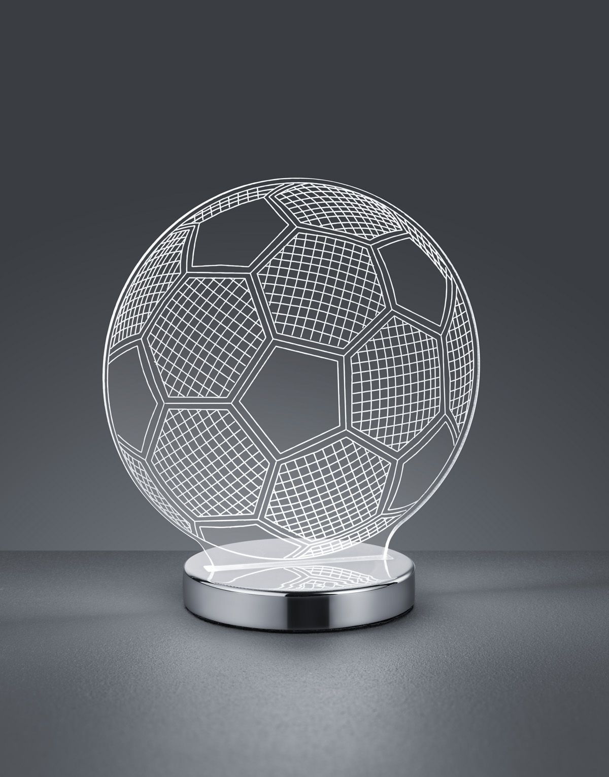 The table lamp with 3D effect is not so much for targeted lighting as it is a real decorative secret weapon. The BALL table lamp in football design should be placed prominently in the interior, as it is a highlight when switched on and off. The light colour can also be adjusted using the conventional cord switch. The colour can be adjusted in stages from 3000, 4000 or 5000 Kelvin using short on/off processes. The clear acrylic lamp head is mounted on a chrome-coloured base and measures approx. 22x22 cm. The integrated LED light source emits a powerful 400 lumens or 7 watts.