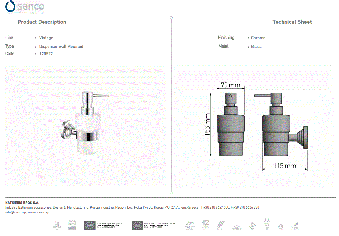 Dispenser Αντλία Σαπουνιού Επίτοιχη Χρωμέ Sanco Vintage 120522-A03