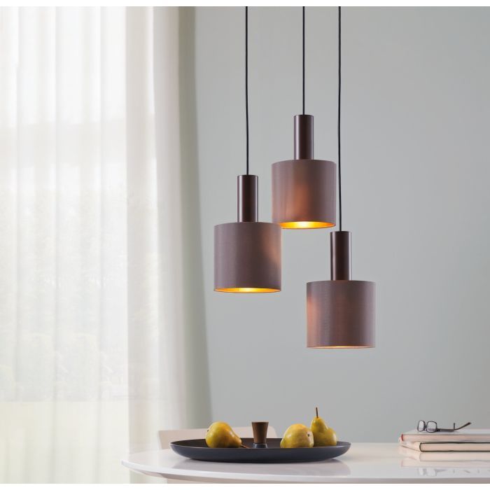 Τρίφωτο κρεμαστό φωτιστικό από την εταιρεία Eglo σε καφέ χρώμα, με υποδοχές για 3 λαμπτήρες και ντουί E27. Είναι κατασκευασμένο από μέταλλο, ένα υλικό δημοφιλή στα κρεμαστά φωτιστικά οροφής, καθώς πέρα από τη μοντέρνα νότα που προσφέρει, είναι ιδιαίτερα ανθεκτικό στον χρόνο. Καθαρίζεται εύκολα με ένα πανί.