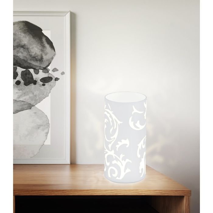 Μοντέρνο πορτατίφ της Eglo με βάση σε λευκό χρώμα, από γυαλί. Διαθέτει ντουί για λαμπτήρες E14.