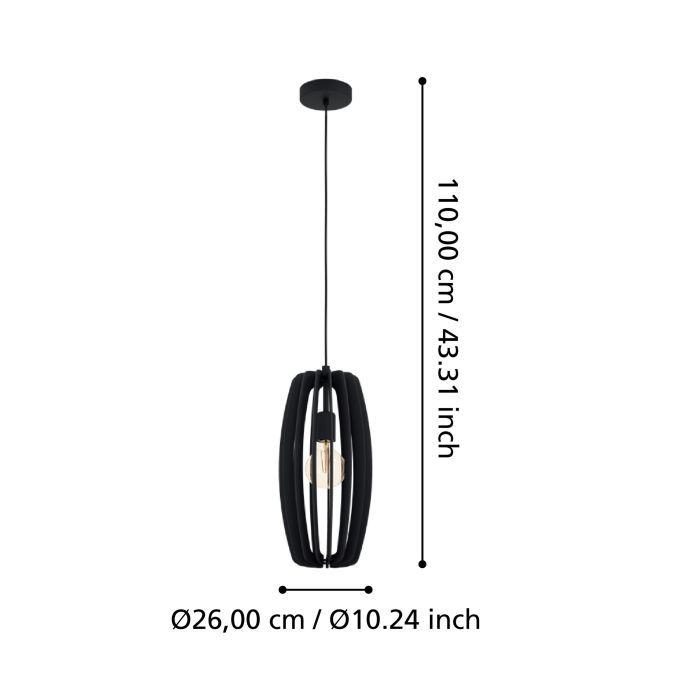 Μονόφωτο κρεμαστό φωτιστικό από την εταιρεία Eglo σε μαύρο χρώμα, με υποδοχή για έναν λαμπτήρα και ντουί E27. Είναι κατασκευασμένο από μέταλλο, ένα υλικό δημοφιλή στα κρεμαστά φωτιστικά οροφής, καθώς πέρα από τη μοντέρνα νότα που προσφέρει, είναι ιδιαίτερα ανθεκτικό στον χρόνο. Καθαρίζεται εύκολα με ένα πανί.