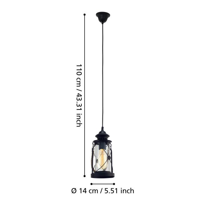 Μονόφωτο κρεμαστό φωτιστικό από την εταιρεία Eglo σε μαύρο χρώμα, με υποδοχή για έναν λαμπτήρα και ντουί E27. Διαθέτει vintage σχεδιασμό που προσδίδει στυλ και χαρακτήρα στον χώρο σας, ενώ ταυτόχρονα δημιουργεί μια ατμόσφαιρα που συνδυάζει την αισθητική του παρελθόντος με τον σύγχρονο σχεδιασμό. Είναι κατασκευασμένο από μέταλλο, ένα υλικό δημοφιλή στα κρεμαστά φωτιστικά οροφής, καθώς πέρα από τη μοντέρνα νότα που προσφέρει, είναι ιδιαίτερα ανθεκτικό στον χρόνο. Καθαρίζεται εύκολα με ένα πανί.