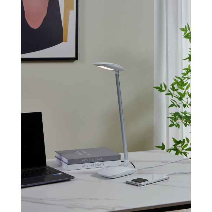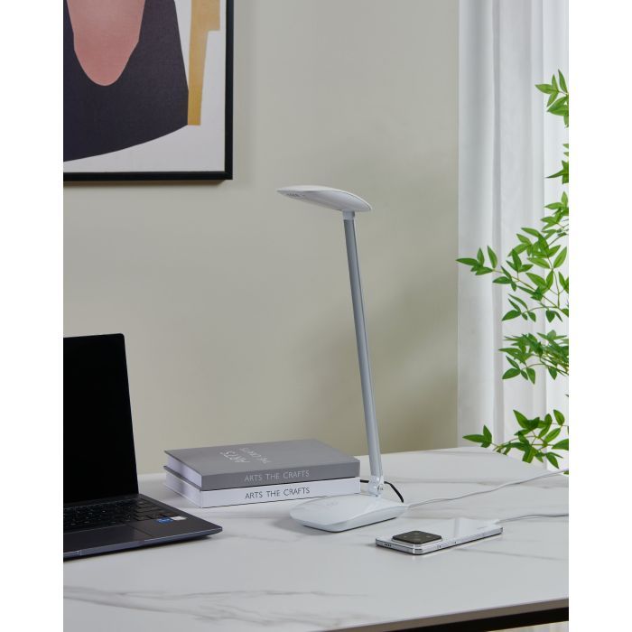 Φωτιστικό γραφείου της Eglo με ενσωματωμένο LED και σπαστό βραχίονα, σε λευκό χρώμα.