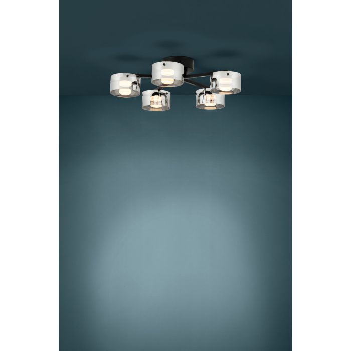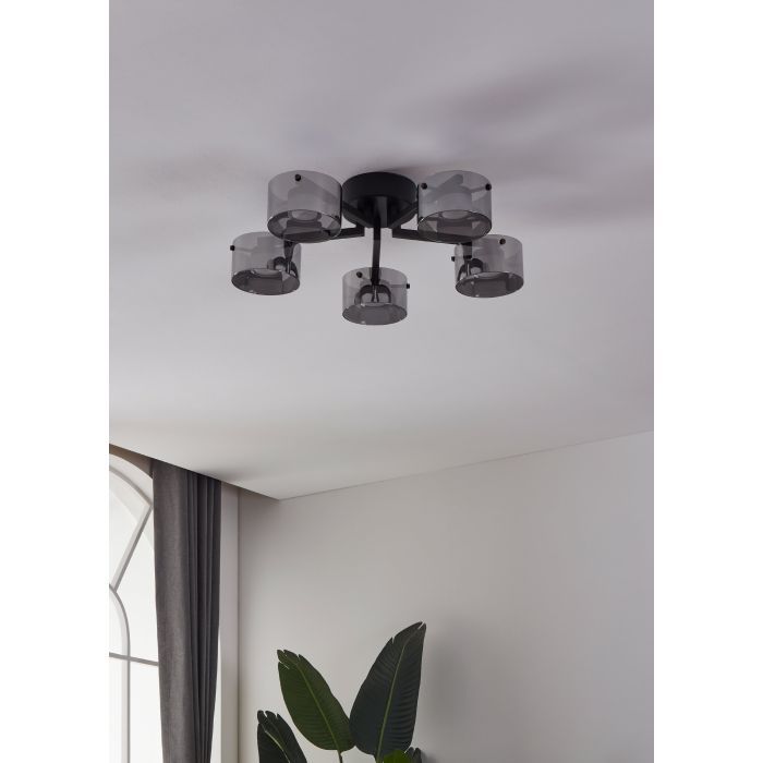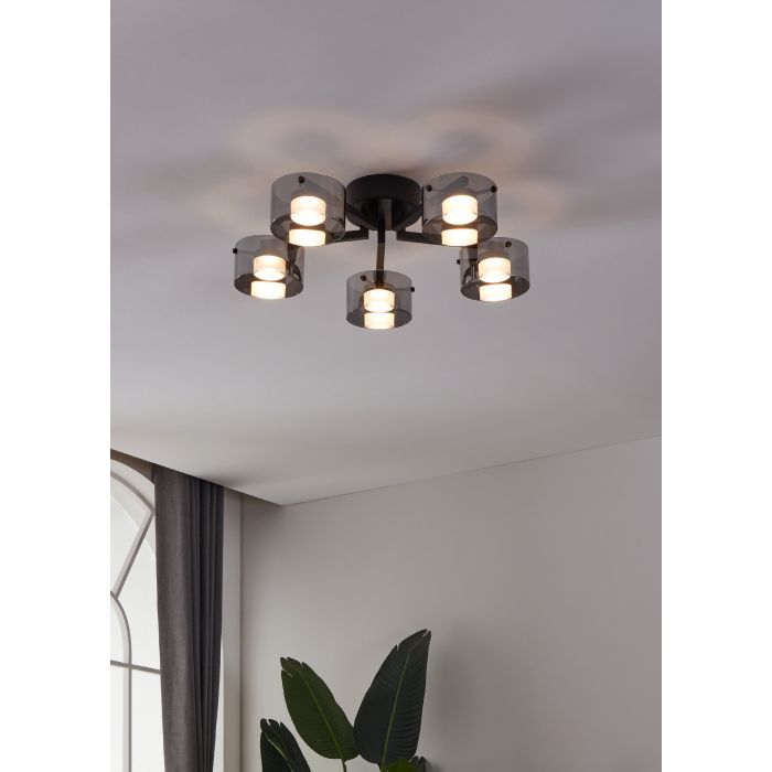 Μοντέρνα πλαφονιέρα οροφής της Eglo σε μαύρο χρώμα, από μέταλλο. Διαθέτει ενσωματωμένο LED, το οποίο εκπέμπει θερμό λευκό φως που αποδίδεται στην κλίμακα Kelvin με τιμές από 2400Κ έως 3800Κ. Αυτοί οι τόνοι του λευκού είναι πιο κίτρινοι σε σχέση με το φυσικό φως.