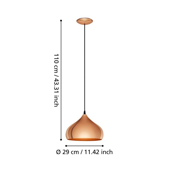 Μονόφωτο κρεμαστό φωτιστικό καμπάνα από την εταιρεία Eglo σε χάλκινο χρώμα, με υποδοχή για έναν λαμπτήρα και ντουί E27. Διαθέτει vintage σχεδιασμό που προσδίδει στυλ και χαρακτήρα στον χώρο σας, ενώ ταυτόχρονα δημιουργεί μια ατμόσφαιρα που συνδυάζει την αισθητική του παρελθόντος με τον σύγχρονο σχεδιασμό. Είναι κατασκευασμένο από μέταλλο, ένα υλικό δημοφιλή στα κρεμαστά φωτιστικά οροφής, καθώς πέρα από τη μοντέρνα νότα που προσφέρει, είναι ιδιαίτερα ανθεκτικό στον χρόνο. Καθαρίζεται εύκολα με ένα πανί.