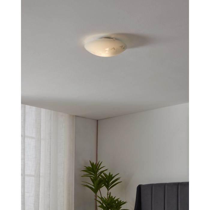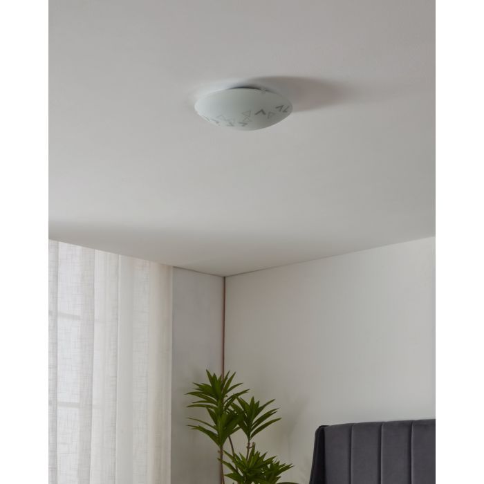 Κλασική πλαφονιέρα οροφής της Eglo σε λευκό χρώμα, από γυαλί. Διαθέτει ντουί για λαμπτήρες E27.
