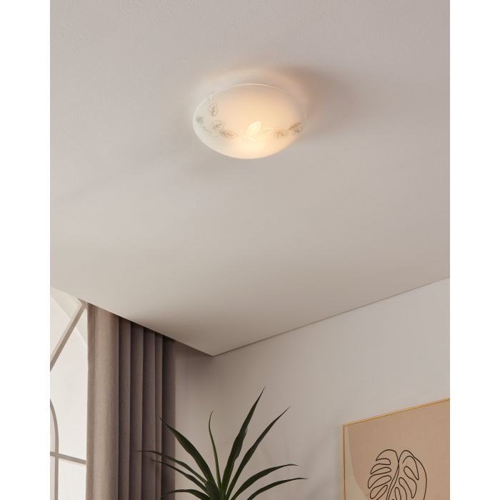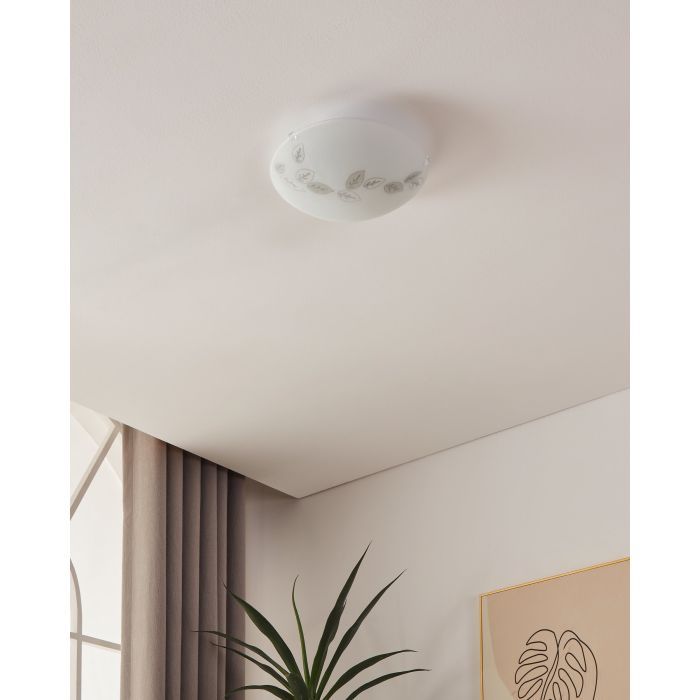 Κλασική πλαφονιέρα οροφής της Eglo σε λευκό χρώμα, από γυαλί. Διαθέτει ντουί για λαμπτήρες E27.
