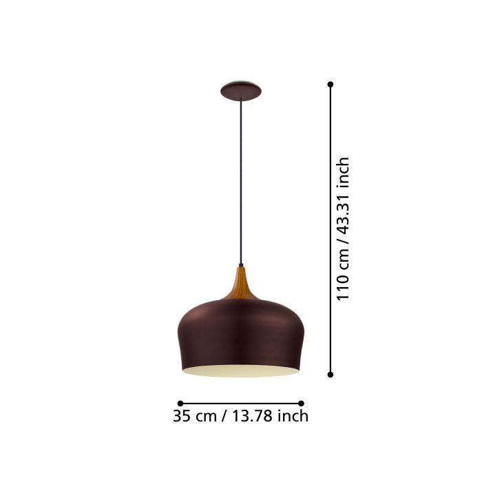 Μονόφωτο κρεμαστό φωτιστικό καμπάνα από την εταιρεία Eglo σε καφέ χρώμα, με υποδοχή για έναν λαμπτήρα και ντουί E27. Διαθέτει vintage σχεδιασμό που προσδίδει στυλ και χαρακτήρα στον χώρο σας, ενώ ταυτόχρονα δημιουργεί μια ατμόσφαιρα που συνδυάζει την αισθητική του παρελθόντος με τον σύγχρονο σχεδιασμό. Είναι κατασκευασμένο από μέταλλο, ένα υλικό δημοφιλή στα κρεμαστά φωτιστικά οροφής, καθώς πέρα από τη μοντέρνα νότα που προσφέρει, είναι ιδιαίτερα ανθεκτικό στον χρόνο. Καθαρίζεται εύκολα με ένα πανί.