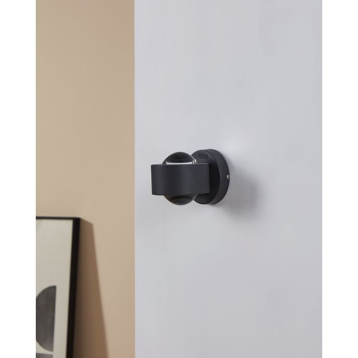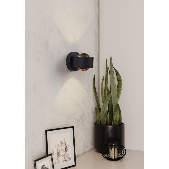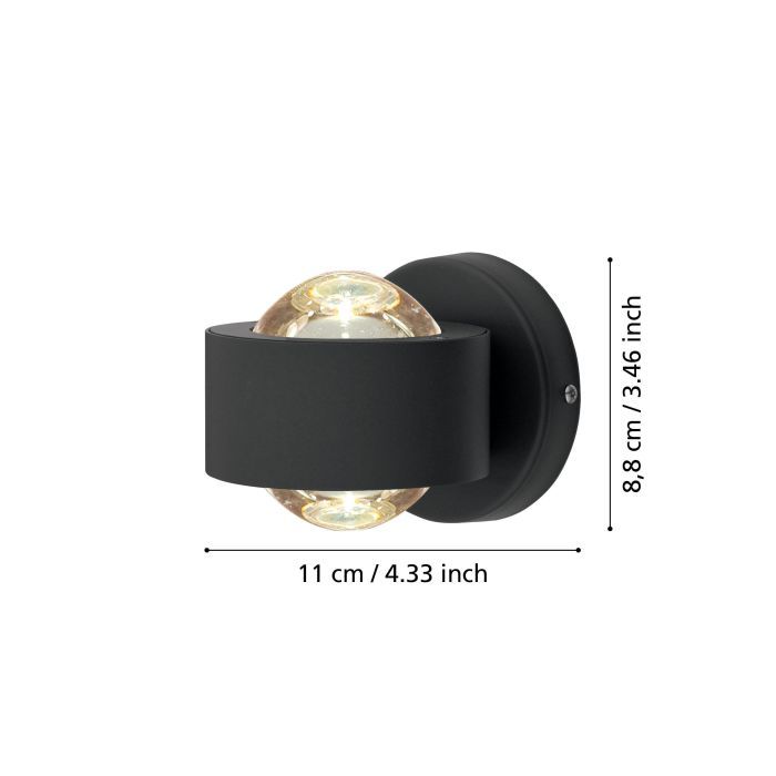 Μοντέρνο φωτιστικό τοίχου της Eglo σε μαύρο χρώμα, με πλάτος 9εκ. Το ενσωματωμένο LED που διαθέτει εκπέμπει θερμό λευκό φως που αποδίδεται στην κλίμακα Kelvin με τιμές από 2400Κ έως 3800Κ. Αυτοί οι τόνοι του λευκού είναι πιο κίτρινοι σε σχέση με το φυσικό φως.