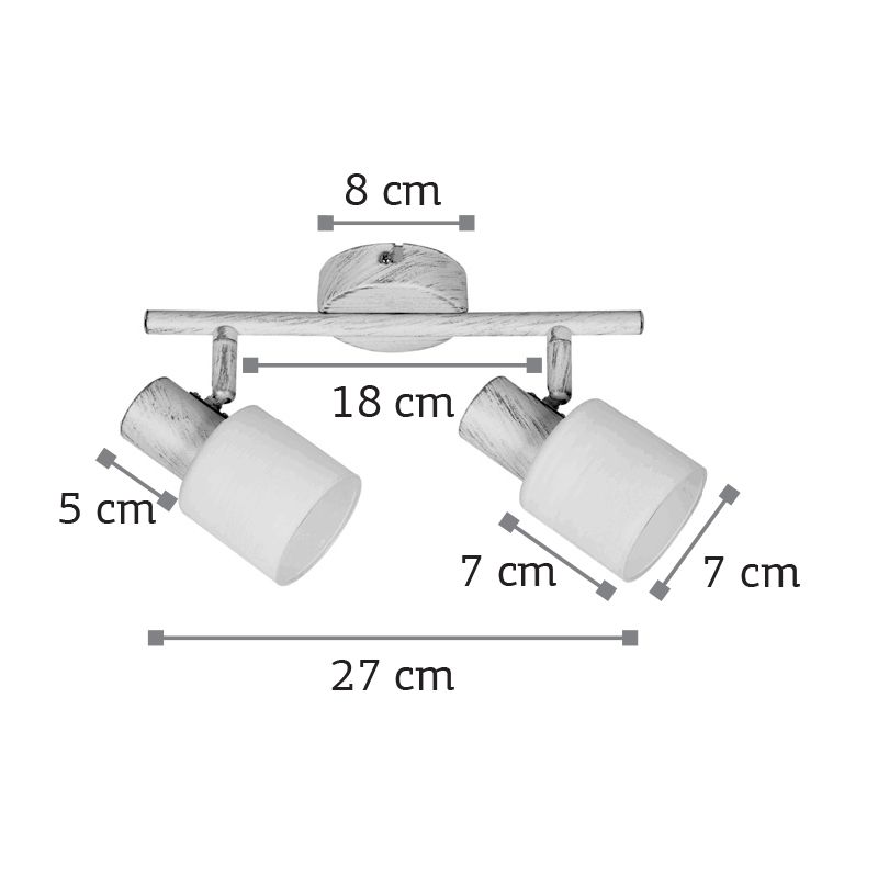 Πρόκειται για ένα μεταλλικό σποτ σε απόχρωση λευκής πατίνας με δύο λαμπτήρες. Το λευκό γυαλί επιτρέπει στο φως να διαχέεται ομοιόμορφα στον χώρο. Το μπροστινό μέρος του κινείται προς οποιαδήποτε κατεύθυνση. Πρόκειται για ένα μεταλλικό σποτ σε απόχρωση λευκής πατίνας με δύο λαμπτήρες. Το λευκό γυαλί επιτρέπει στο φως να διαχέεται ομοιόμορφα στον χώρο. Το μπροστινό μέρος του κινείται προς οποιαδήποτε κατεύθυνση.
