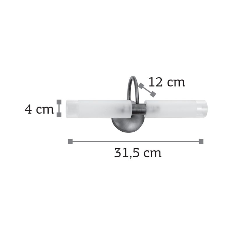 Πρόκειται για ένα επιτοίχιο φωτιστικό κατασκευασμένο από μέταλλο σε νίκελ ματ απόχρωση με δύο λαμπτήρες που καλύπτονται από κυλινδρικό γυαλί αμμοβολής με διάφανες λεπτομέρειες. Είναι η ιδανική επιλογή για φωτισμό μπάνιου τοποθετημένο πάνω από τον καθρέπτη αφού το φως διαχέεται ομοιόμορφα.  Πρόκειται για ένα επιτοίχιο φωτιστικό κατασκευασμένο από μέταλλο σε νίκελ ματ απόχρωση με δύο λαμπτήρες που καλύπτονται από κυλινδρικό γυαλί αμμοβολής με διάφανες λεπτομέρειες. Είναι η ιδανική επιλογή για φωτισμό μπάνιου τοποθετημένο πάνω από τον καθρέπτη αφού το φως διαχέεται ομοιόμορφα.