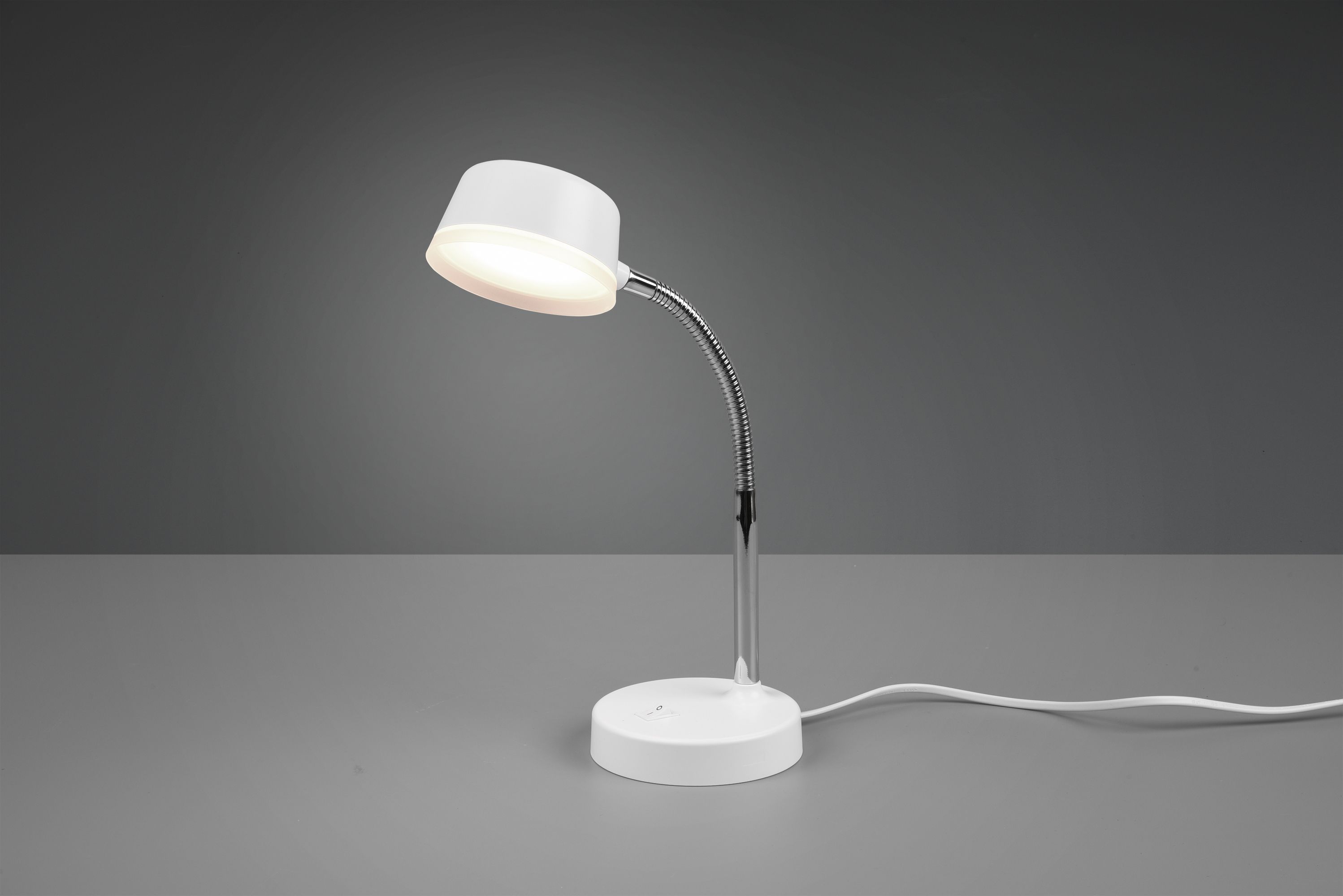 Φωτιστικό γραφείου της Trio Lighting με ενσωματωμένο LED και εύκαμπτο βραχίονα, σε λευκό χρώμα.