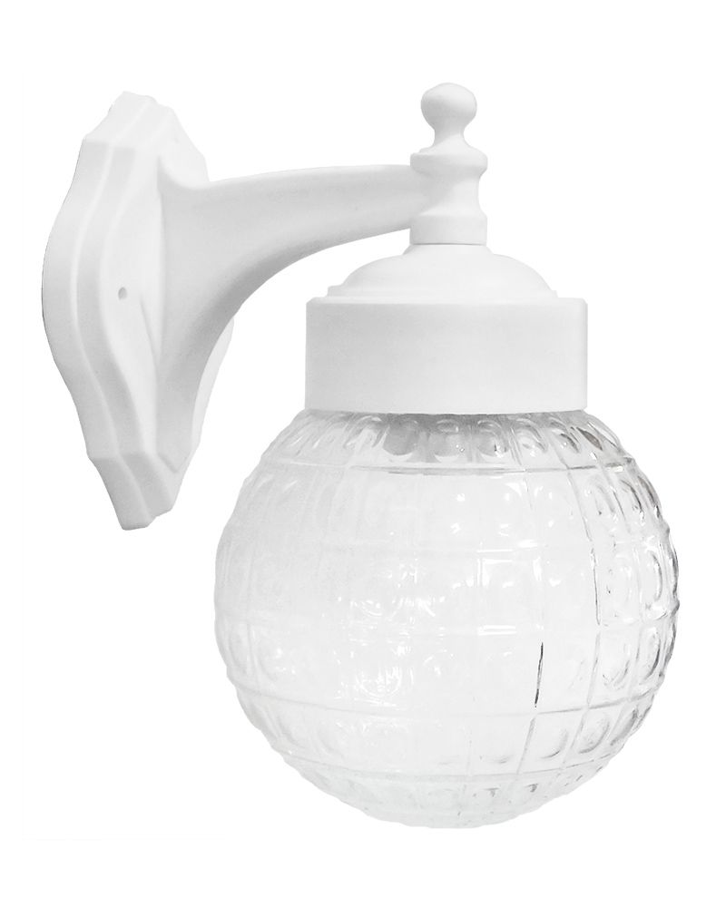 Απλίκα τοίχου LP-110AN WHITE-TRANS Τεχνικές προδιαγραφές πλαστικό μπράτσο και γυαλί βιδωτό σε σχήμα μπάλα χρώμα : white / λευκό Η23 x 21 x Φ15cm E/27 LED IP44 Ελληνικό Προϊόν