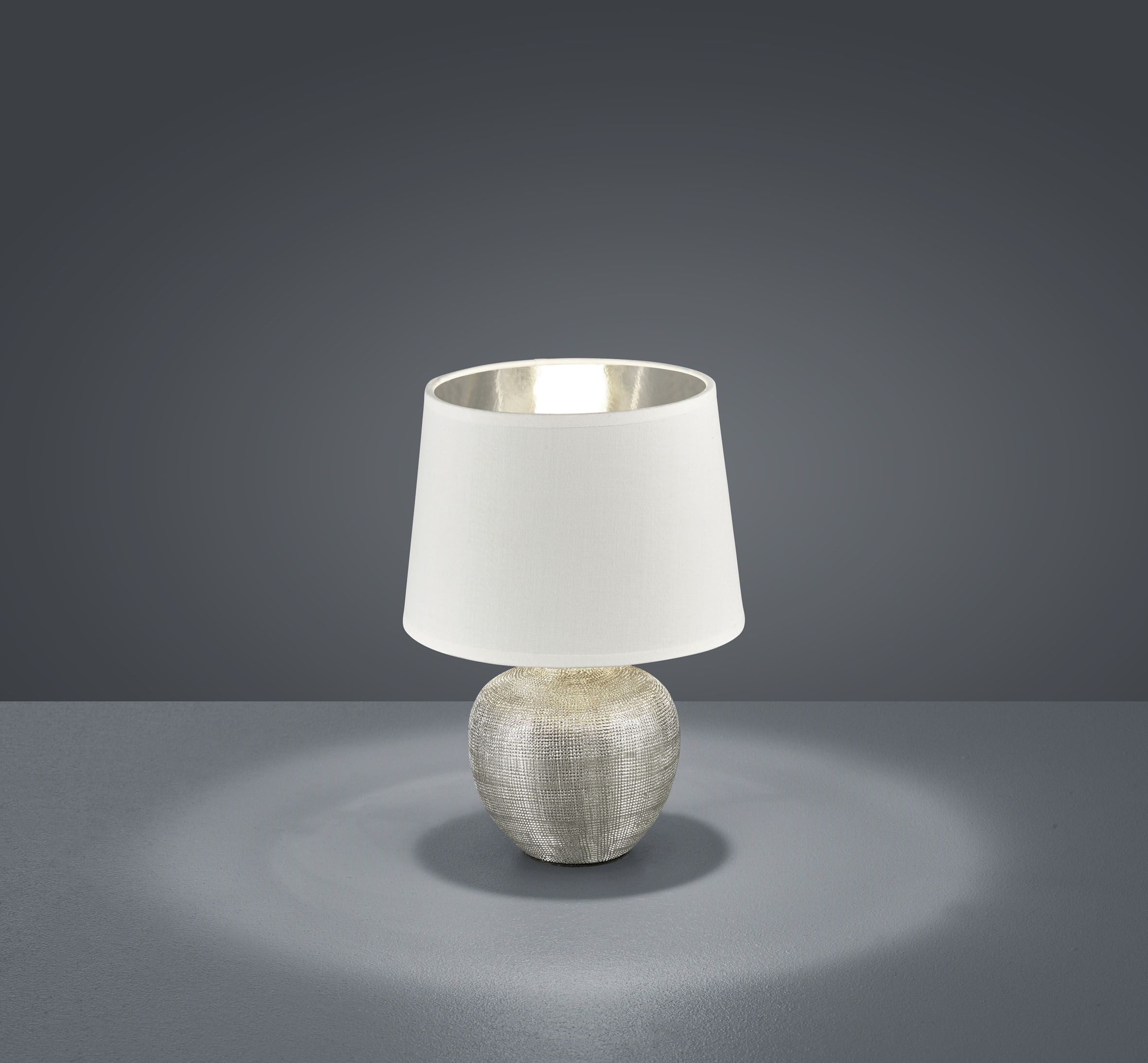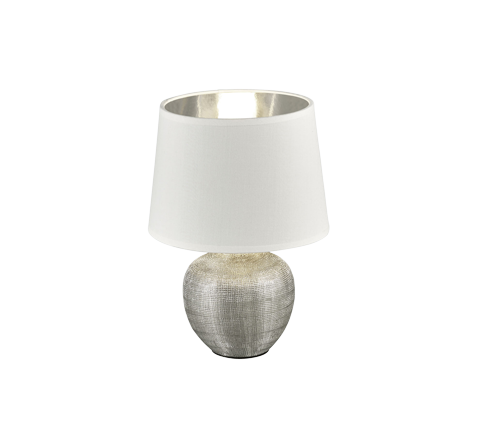Μοντέρνο πορτατίφ της Trio Lighting με λευκό καπέλο και βάση σε ασημί χρώμα, από κεραμικό υλικό. Διαθέτει ντουί για λαμπτήρες E14.