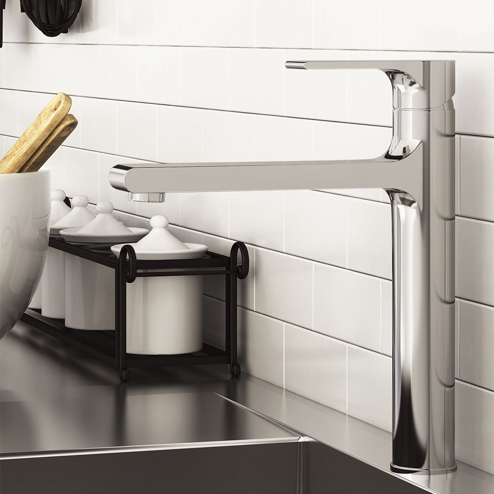 Μπαταρία κουζίνας Orabella, Falcon με περιστρεφόμενο κορμό και με μια λαβή στο πάνω μέρος της μπαταρίας για εύκολη ρύθμιση της ροής και της θερμοκρασίας του νερού. Πρόκειται για μια μοντέρνα μπαταρία πάγκου, η οποία είναι κατασκευασμένη από τον οίκο Orabella, από υψηλής ποιότητας ορείχαλκο που προορίζεται τόσο για οικιακή, όσο και για επαγγελματική χρήση.