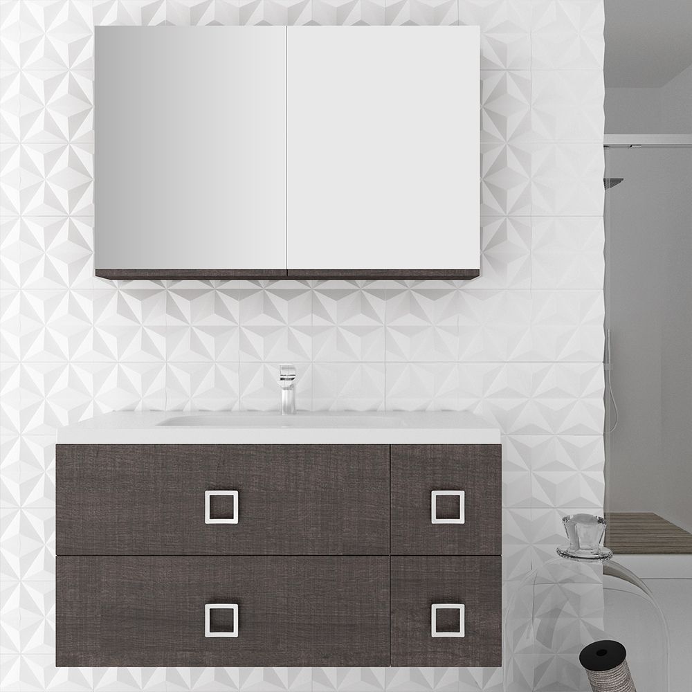 Κρεμαστό έπιπλο μπάνιου Mood 100 – σειρά επίπλων Slim. Ένα έπιπλο μπάνιου, βαρέως τύπου ιδανικό για οικιακή χρήση. Αποτελείται από, κρεμαστή βάση με δύο πόρτες ή δύο πόρτες και δύο συρτάρια ή τέσσερα συρτάρια ή μια πόρτα και δύο συρτάρια, με μηχανισμούς κλεισίματος soft close και νιπτήρα από πορσελάνη. Μπορείτε να ολοκληρώσετε την εικόνα του επίπλου προσθέτοντας καθρέπτη δικής σας επιλογής (ντουλάπι, εταζέρα με ντουλαπάκια ή καθρέπτη με πλαίσιο) και τα πόμολα που ταιριάζουν στο δικό σας μπάνιο. Όλα τα έπιπλα της εταιρείας Orabella μπορούν να πάρουν στήλες μπάνιου επιδαπέδιες ή κρεμαστές για επιπλέον χώρο αποθήκευσης, ενώ υπάρχει δυνατότητα προσθήκης ντουλαπιού πλυντηρίου σε χρώμα δικής σας επιλογής. Διατίθεται σε έξι διαφορετικές αποχρώσεις ξύλου και σε λευκό χρώμα-Laminate καθώς και σε μαύρο και λευκό γυαλιστερό και ματ ακρυλικό σε mdf. Κατόπιν επιλογής, μπορεί να συνοδευτεί με γραμμικό φωτιστικό μπάνιου Led.