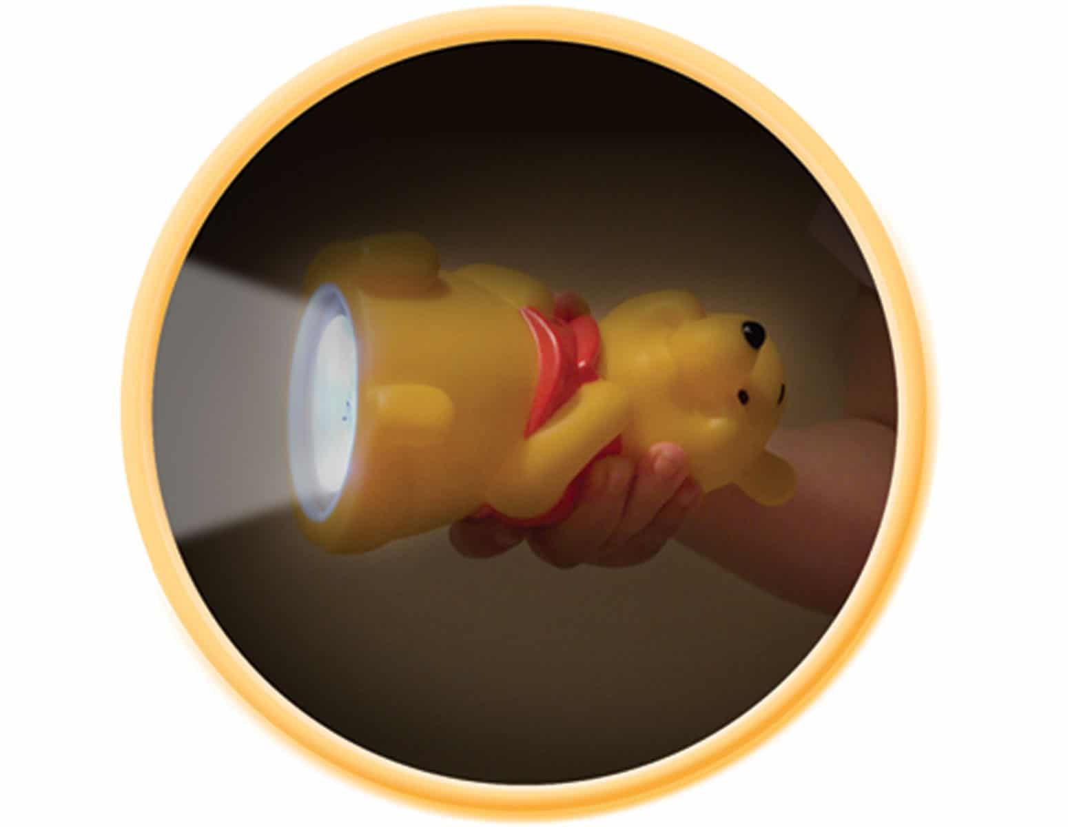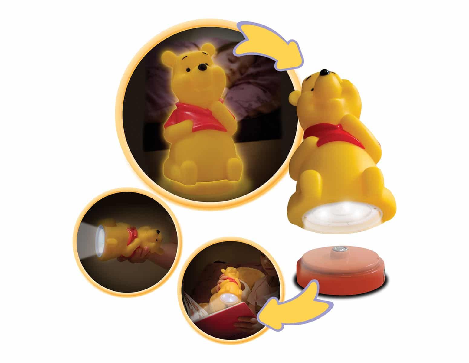 Φωτιστικό νύκτας και φακός. Τρισδιάστατη 3D σχεδίαση δίνει ένα αίσθημα ασφάλειας στα παιδιά όταν είναι μόνα στο σκοτεινό δωμάτιο αλλά χρησιμοποιούμενο ως πανίσχυρος φακός είναι ιδανικό για «γενναία ταξίδια στο μπάνιο». Φτιαγμένο ειδικά για μικρά αδέξια χέρια είναι εύκολο στη χρήση και ανθεκτικό στα χτυπήματα και τις πτώσεις. Είναι επαναφορτιζόμενο, εύκολο στο πακετάρισμα για ταξίδια και τέλειο για εξερευνήσεις και διάβασμα μυστηρίου τη νύκτα. Το Winnie the Pooh κομοδίνου & φακός 2 σε 1 LED προσφέρει λύσεις φωτισμού νύκτας αλλά και διασκέδασης.
